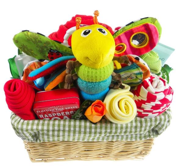 Deluxe Bright Baby Gift Flower Basket. This deluxe bright and fun baby arrangement contains everything needed for a special new one including blanket, romper, socks, washcloths, special baby toiletries, bibs and a beautiful soft toy.