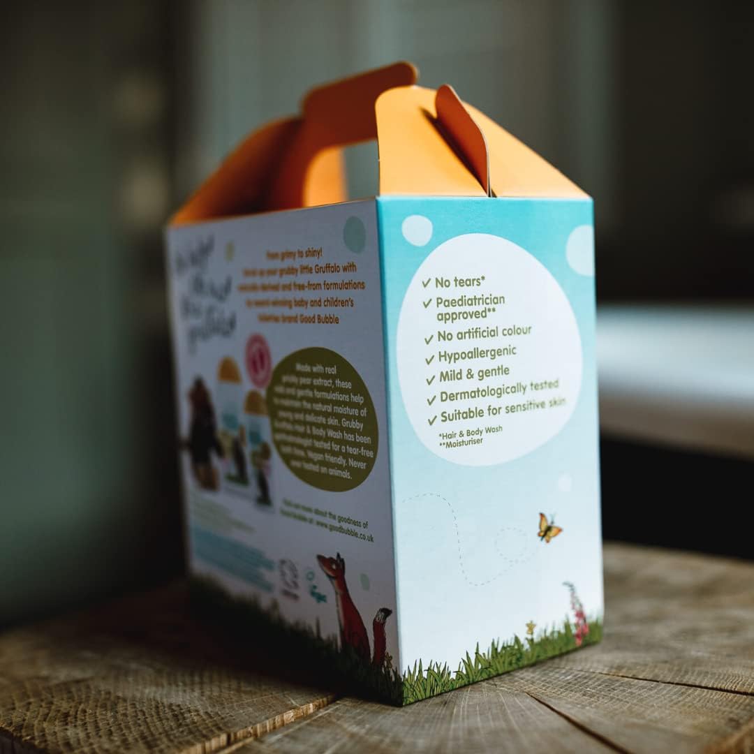 Good Bubble Gruffalo Bath Time Gift Set  - a gorgeous gift set featuring Gruffalo Hair & Body Wash, Little Softy Moisturiser and a sweet Gruffalo soft toy - all packaged in a fun gift box.