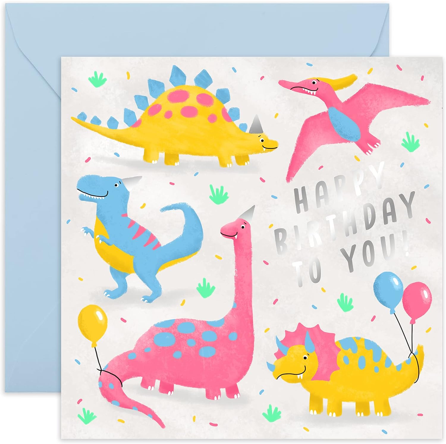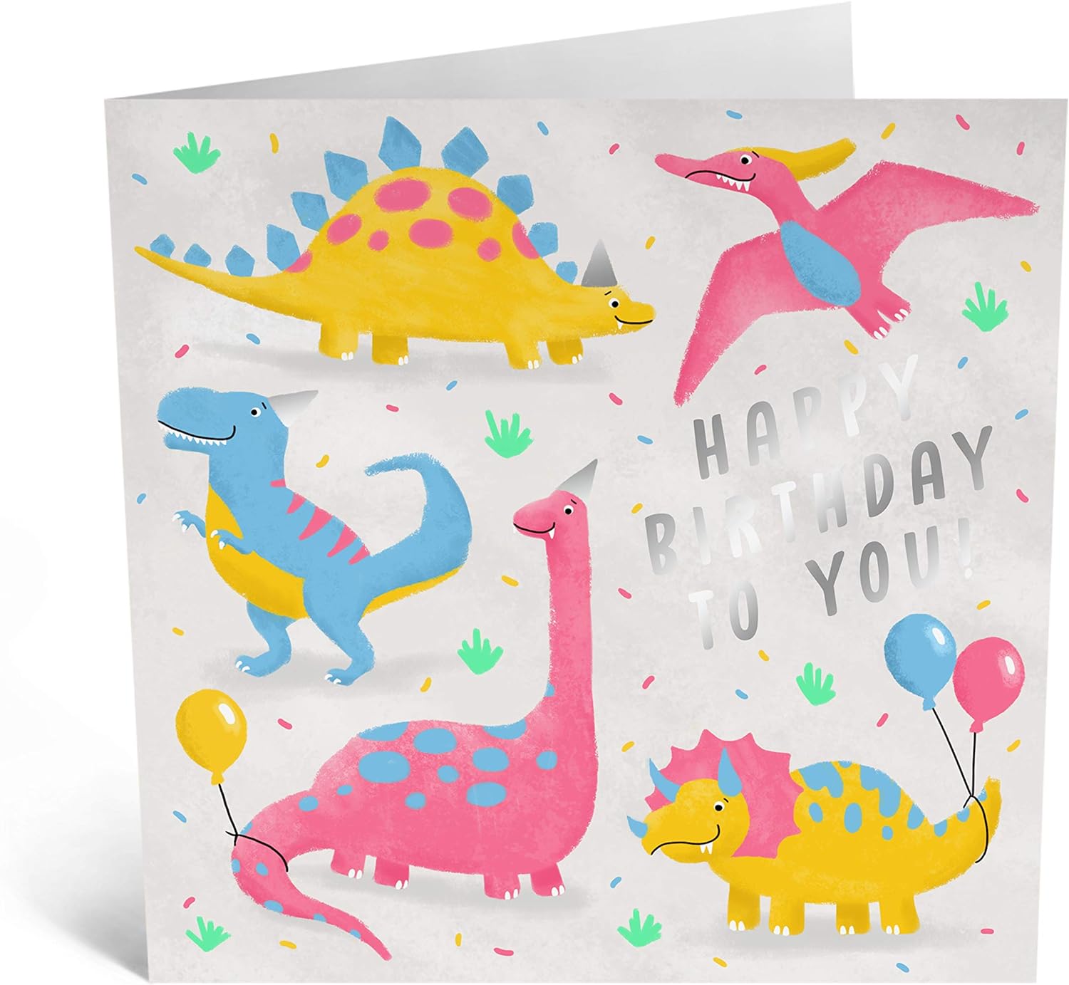 This fun card features colourful happy dinosaurs, with party balloons and the words "Happy Birthday To You!