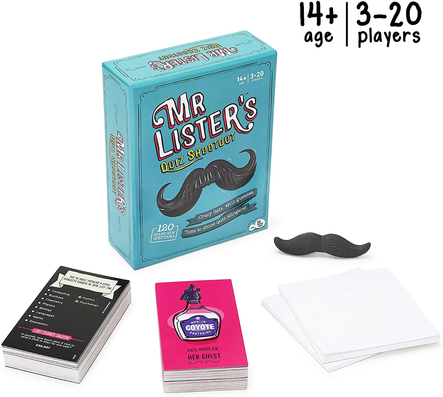 A russian roulette trivia game with brains instead of guns. Mr. Lister puts on the moustache, asks a multi-answered question and players fight to stay in the game. Get it wrong you’re out; get a golden answer, you’re straight to the shootout round.