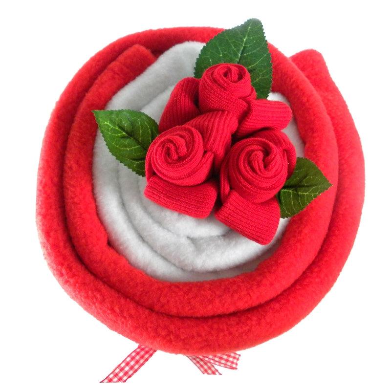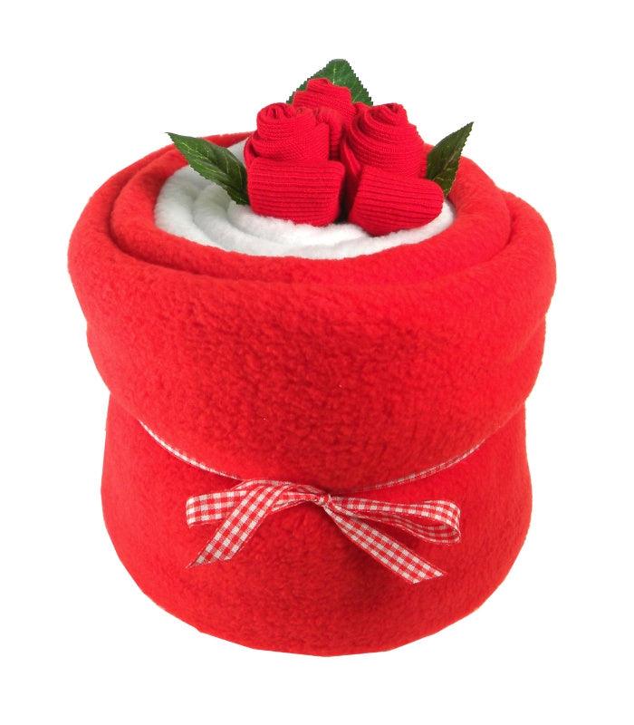 Featuring two soft and fluffy baby blankets, the arrangement also includes three pairs of sweet baby socks in red, (each "bud" hand-crafted into a delicate flower).