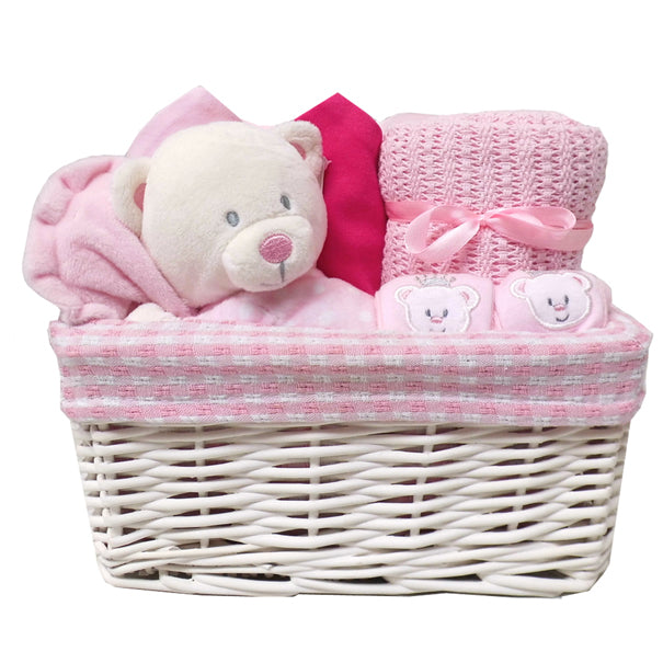 Natural wicker gift basket with pink and white gingham lining. Great as a small basket to fill with baby girl gifts. Pick your contents and we'll wrap the basket complete with your personal card message.