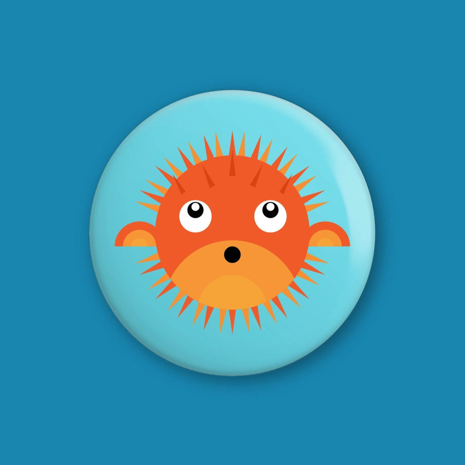 Hey There Munchquin Pufferfish Button Badge - a quirky and fun pin badge featuring a cute orange pufferfish!
