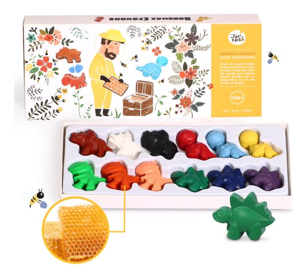 Jar Melo's farbenfrohe und lustige Bienenwachsmalstifte in Dino-Form. Diese tollen Malstifte werden aus reinem Bienenwachs und einer Mischung aus Dinosaurierformen und -farben hergestellt!