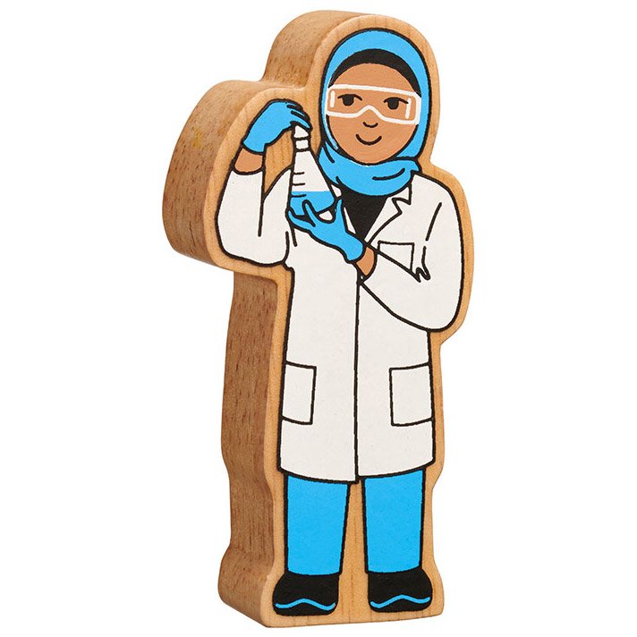 Diese farbenfrohe hölzerne Spielzeugfigur „Wissenschaftler“ von Lanka Kade ist perfekt für kleine Hände und ideal für Geschichtensäcke, zum Stapeln und für fantasievolles Spielen!