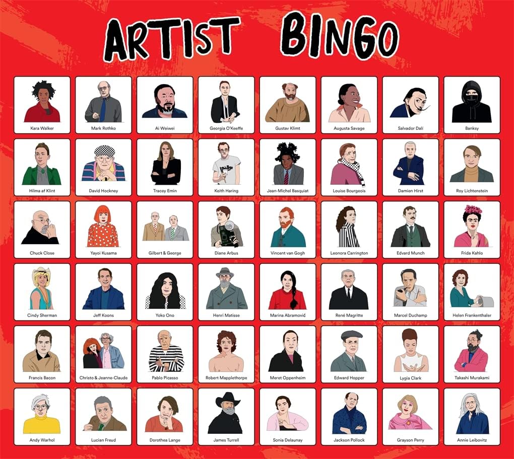 Here you'll find the world's best painters, sculptors, performance artists and photographers assembled together - in a handy game box. From Banksy to Basquiat, Haring to Hockney and Yayoi to Yoko, Artist Bingo is the perfect chance to see your favourites and discover lesser-known artistic geniuses along the way.