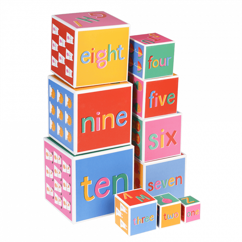Die Blöcke sind mit einer Reihe leuchtender und farbenfroher Illustrationen versehen und zeigen auf der einen Seite Buchstaben des Alphabets und auf der anderen Seite Zahlen. Ideal zur Förderung der Buchstaben- und Zahlenkompetenz.