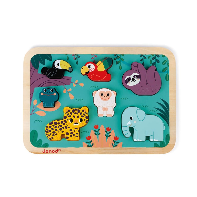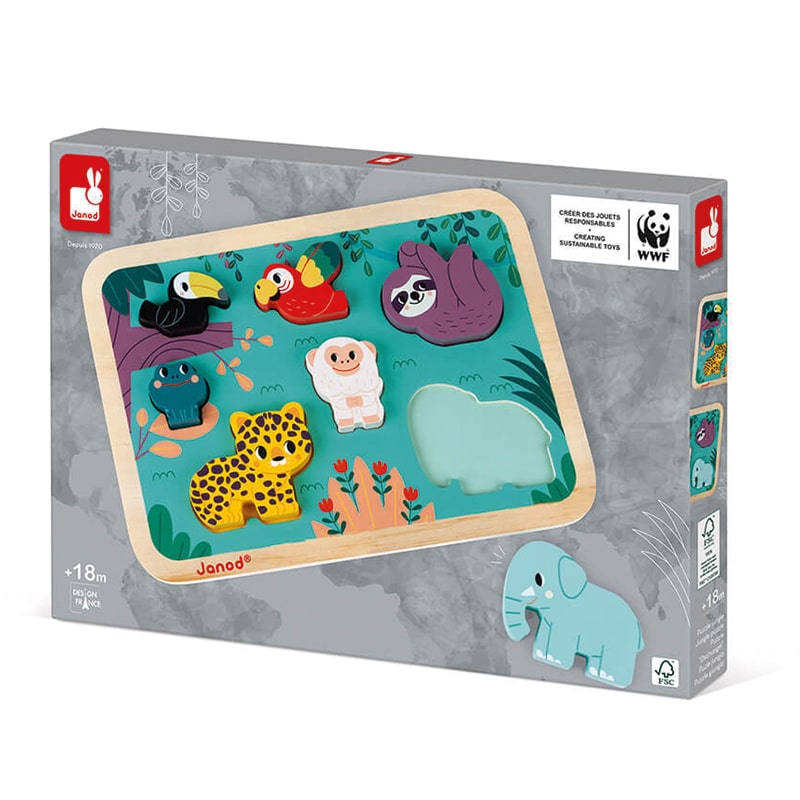 Dieses schöne, klobige Puzzle von Janod ist ein wunderschön illustriertes Holzpuzzle zum Thema WWF-Dschungeltiere.