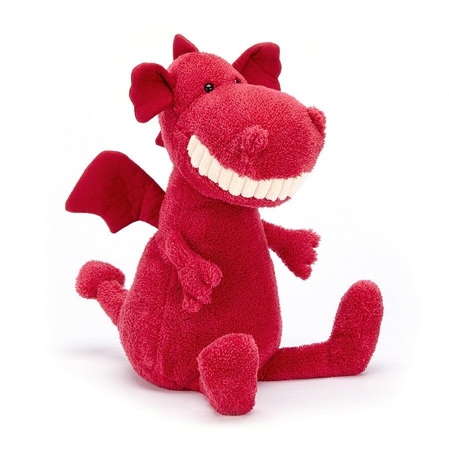 Der Toothy Dragon vom renommierten Hersteller Jellycat hat kirschrotes Fell, superweiche Flügel, kleine schwarze Augen und natürlich ein riesiges Beißerchen-Set aus Cord! Achtung – er ist einfach bezaubernd! (Größe L – ca. 36 cm).