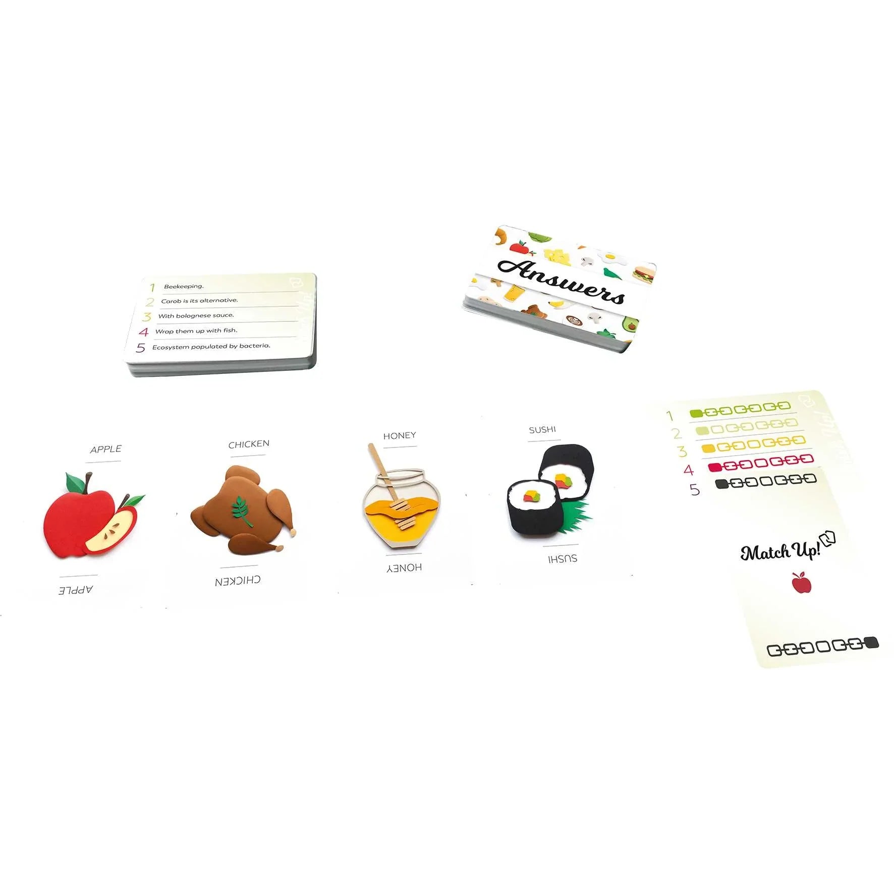 Match Up Food - a fun cooperative trivia game where players team up to find the key amongst the 50 cards featuring unique food-related art.