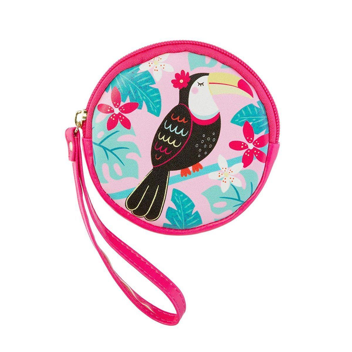 Ein süßes und farbenfrohes Portemonnaie mit einem hübschen TikI-Tukan-Design – hübsche Rosatöne, grüne Palmen und ein leuchtender Tukan.