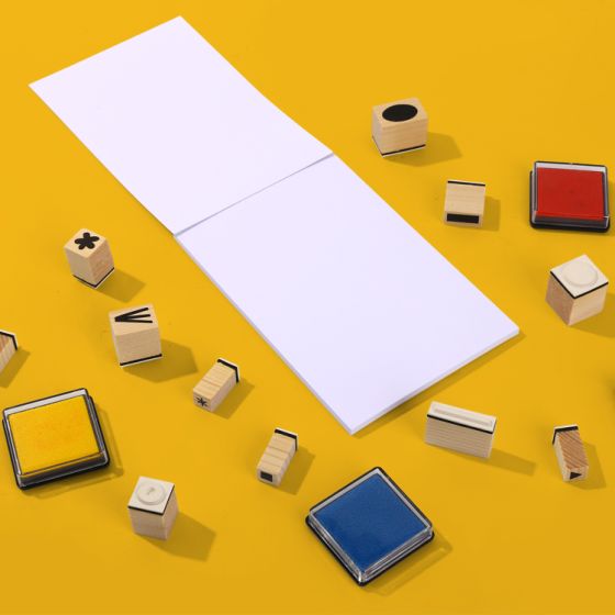 Gestalten Sie mit den 12 Stempeln verschiedene Szenen und farbenfrohe Bilder Ihrer Fantasie. Jeder Stempel ist einzigartig und zeigt unterschiedliche Formen, von Herzen bis hin zu Kreisen. Das Set enthält 6 Stempelfarben und 12 Holzstempelblöcke.
