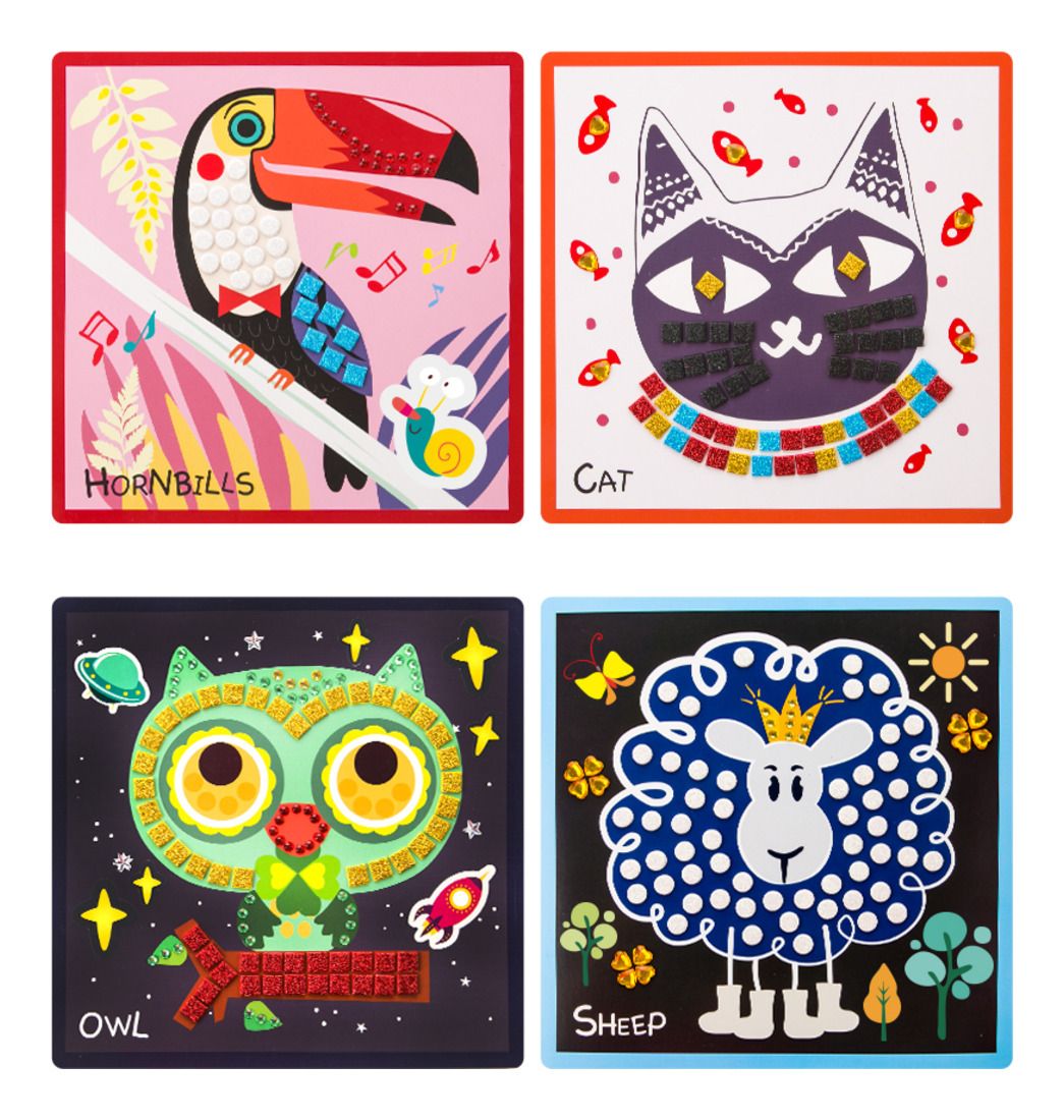 Ce kit comprend 8 feuilles de cartes d'animaux de dessins animés, 3 types d'autocollants de bijoux, des pièces de mousse autocollantes colorées, 2 feuilles d'autocollants adhésifs pour la décoration, 3 supports et 1 livret d'instructions.