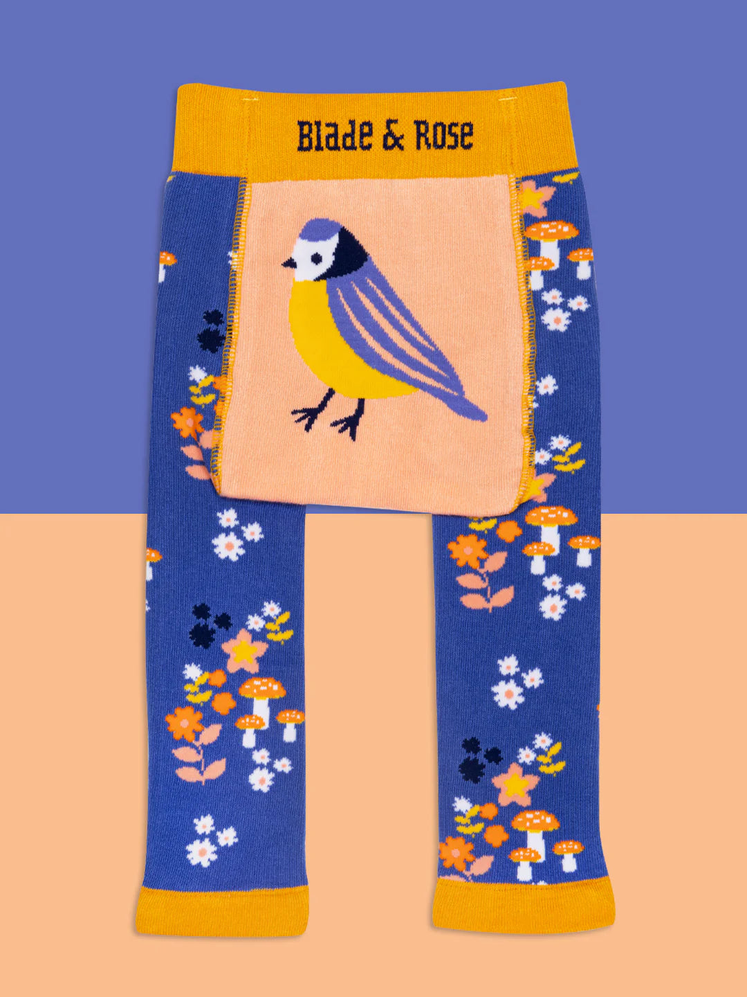 Leggings Blade & Rose Kind to Nature : audacieux, lumineux et amusants ! Ces superbes leggings arborent de magnifiques jambes à fleurs violettes sur fond pêche et un motif mésange bleue en bas !