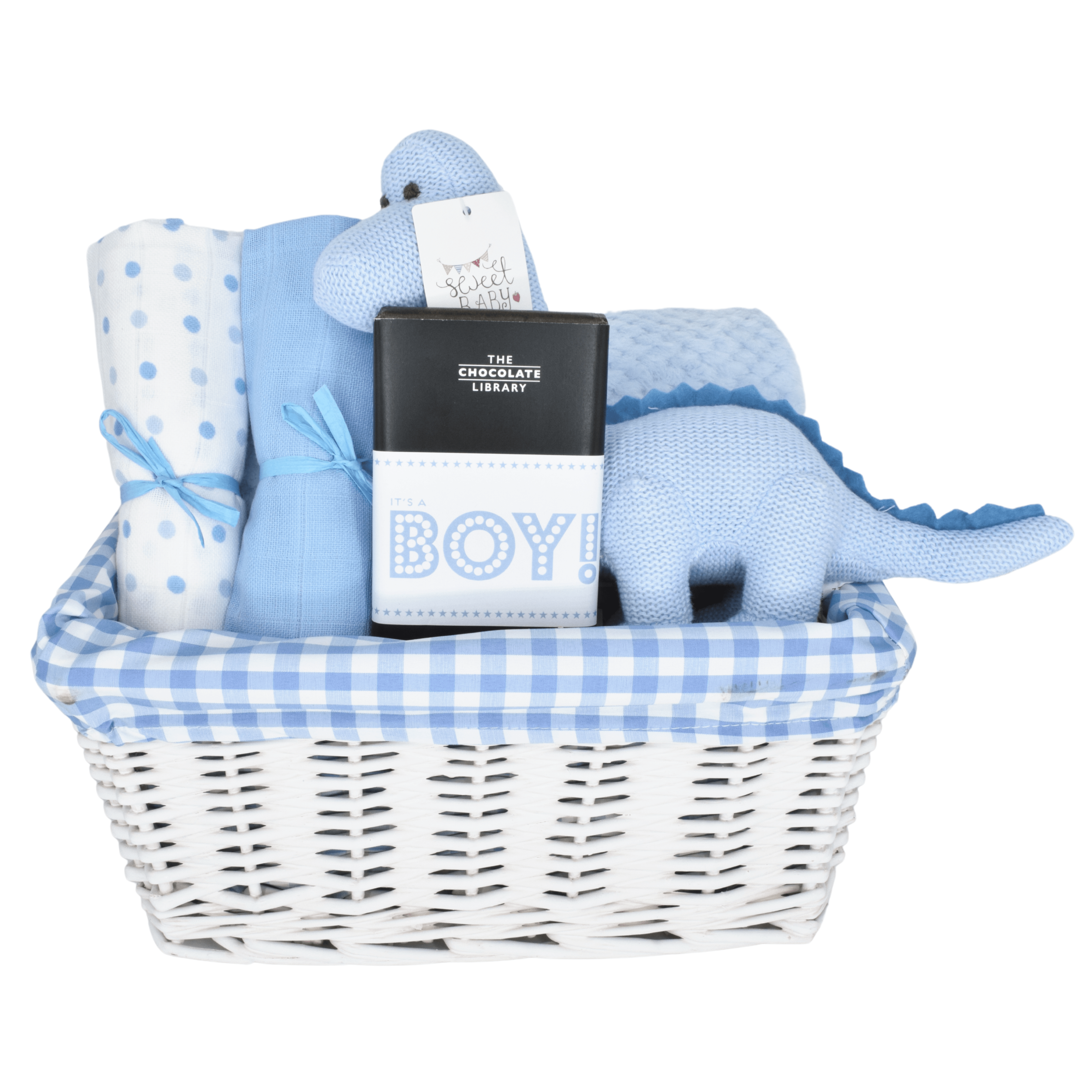 Le panier comprend une douce couverture pour bébé de style gaufré bleu, des carrés de mousseline pratiques, un adorable jouet dinosaure Diplodocus avec un hochet doux en coton biologique et une barre de message au chocolat « C'est un garçon ! ».