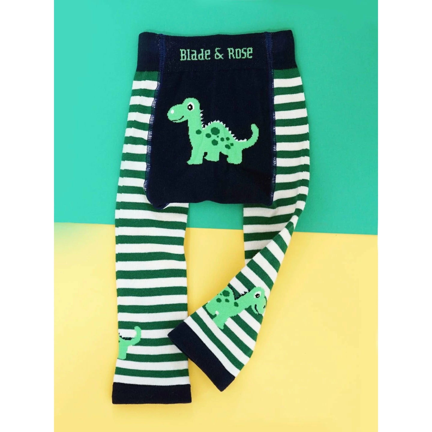 • Legging Blade & Rose Maple Dino. Ce superbe legging présente une alternance de rayures crème et vertes, avec le petit Maple le dinosaure sur chaque jambe et un fessier bleu marine contrastant.