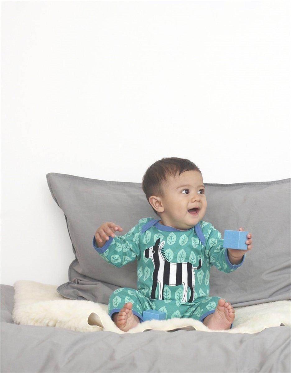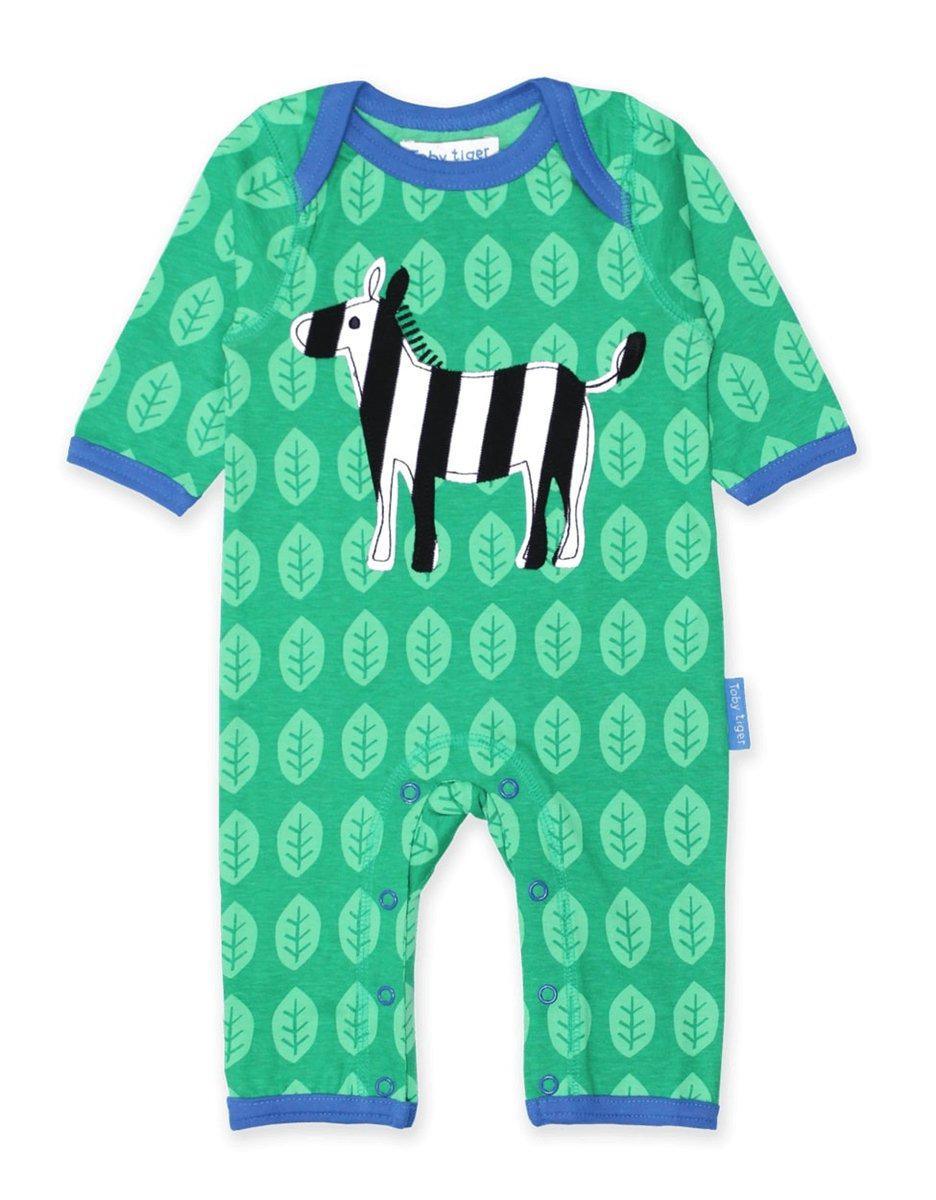 Fabuleuse, originale et amusante, cette grenouillère rayée à motif zèbre de Toby Tiger est un magnifique cadeau pour bébé. Avec son joli imprimé feuilles vertes et ses bordures bleues contrastantes, cette grenouillère colorée fera sensation !