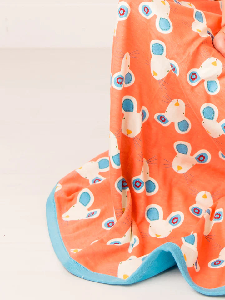 Blade & Rose Maura The Mouse Blanket - bold, bright and fun! This gorgeous blanket is made from soft cotton in coral with Maura the Mouse design on one side and contrasting blue on the reverse.