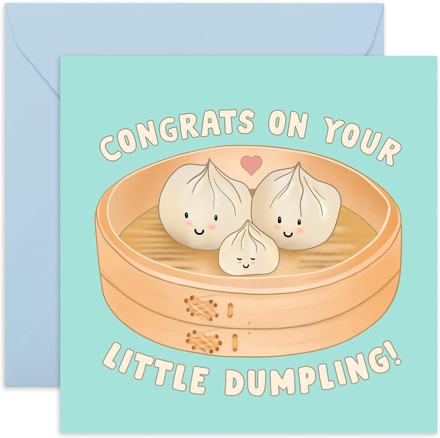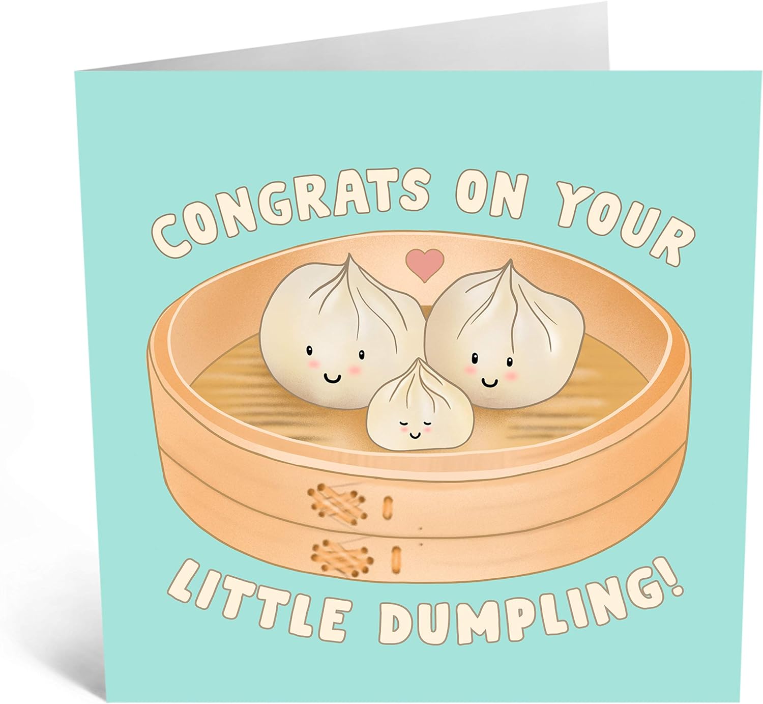 This fun card features a sweet drawing of a family of 3 dumplings and the words "Congrats on Your Little Dumpling"