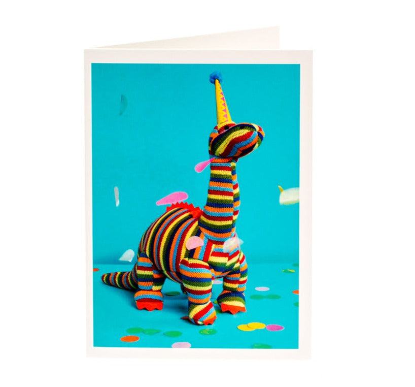 Send celebration wishes with this fab dinosaur card! Featuring a striped Diplodocus Dino in a fun party hat with a bright blue background, this card is blank inside and can be used for different occasions including New Baby Wishes, Congratulations or Happy Birthday!
