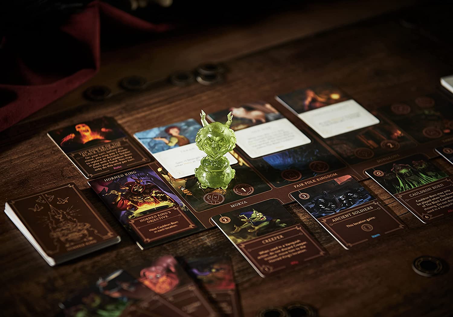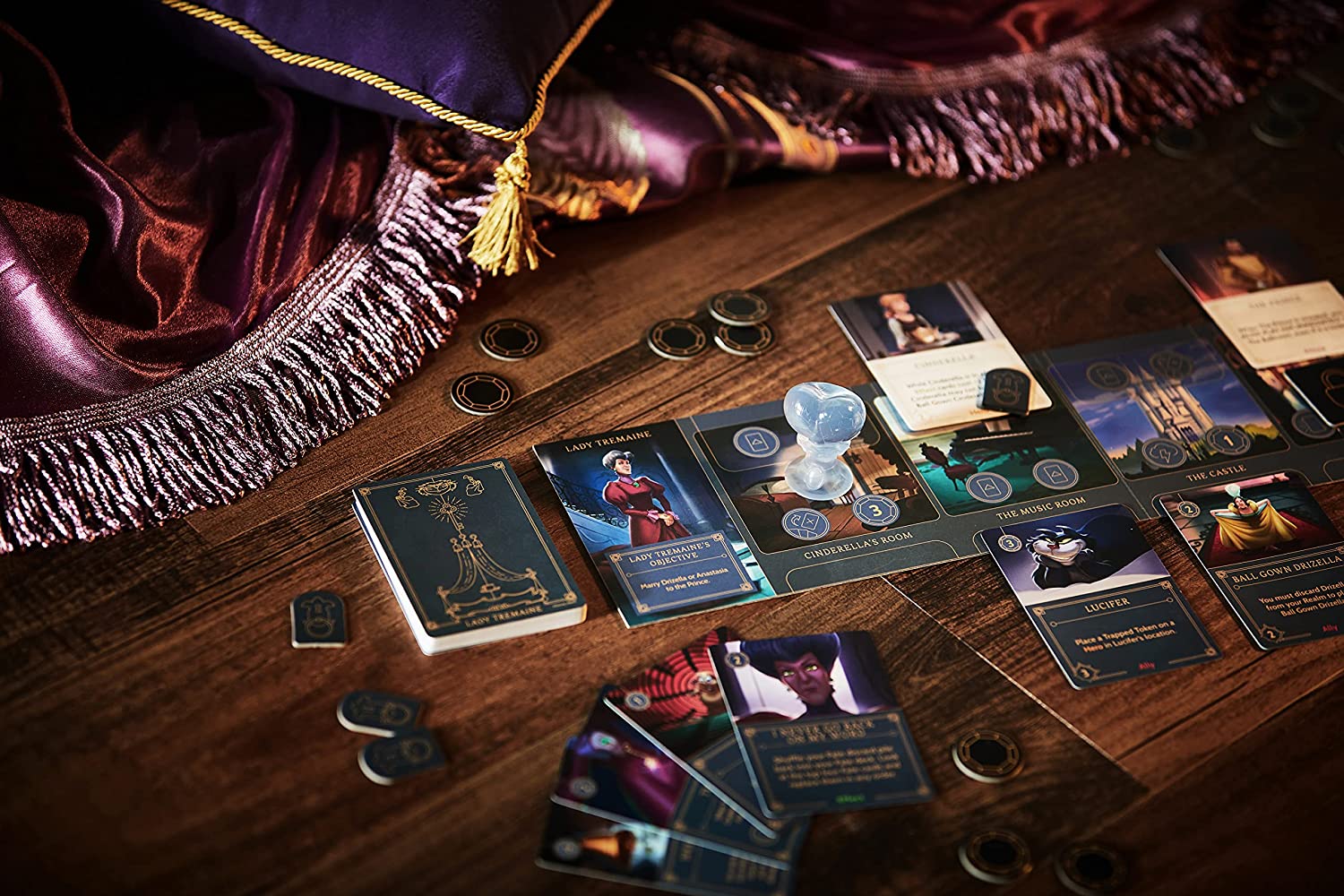 In Villainous: Despicable Plots, each player takes control of one of three Disney characters, each one a villain in a different Disney movie, specifically Lady Tremaine (Cinderella), the Horned King (The Black Cauldron), and Gaston (Beauty and the Beast). Each player has their own villain deck, fate deck, player board, and 3D character.