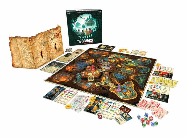 The remaining players take on the roles of the Goonies - Mikey, Mouth, Chunk, Data, and Sloth - to work together, use strategy, and rely on Data's clever inventions to overcome enigmatic riddles and deadly obstacles. Will the Goonies uncover the legendary wealth that will save their homes, or will they meet the same fate as Chester Copperpot... and never see the light of day?