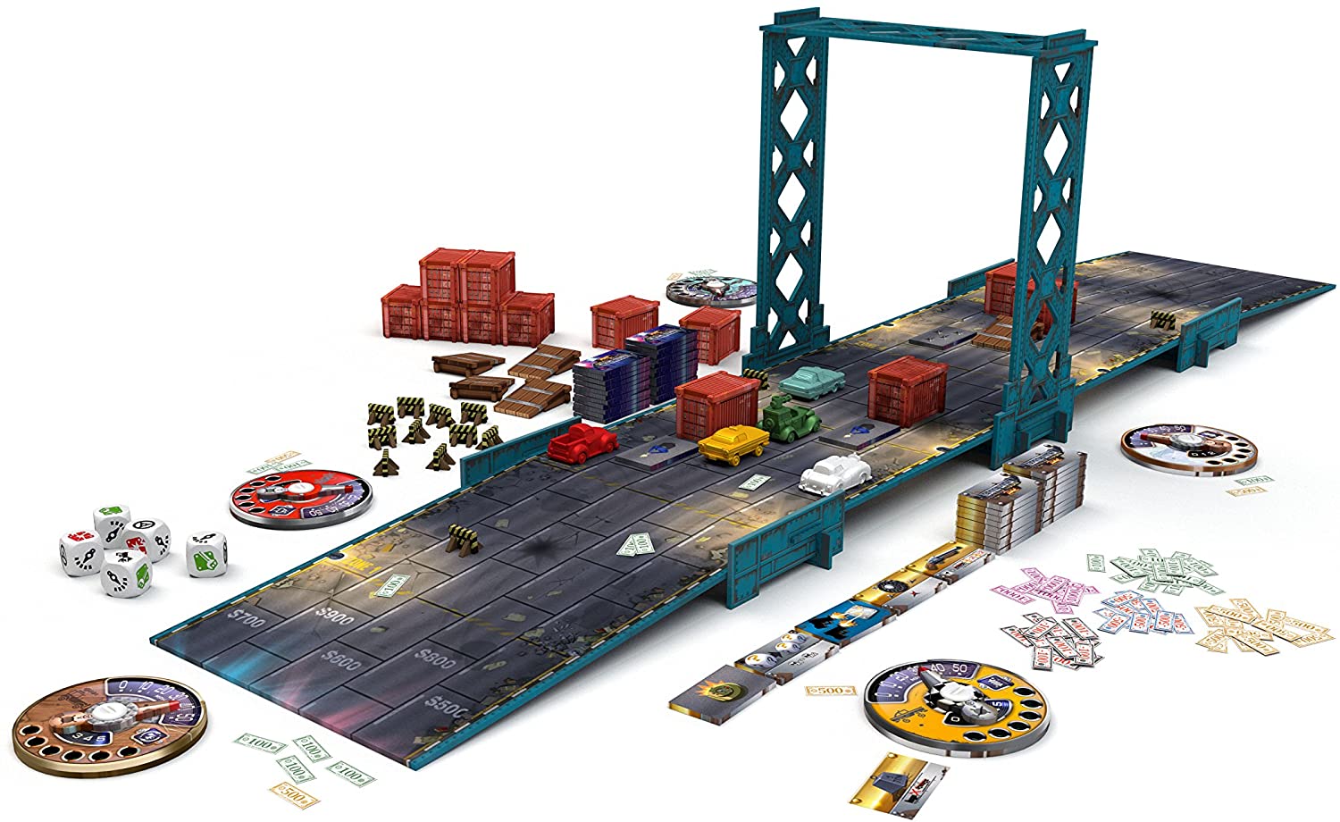 All the action takes place on a unique 3D bridge game board. The raised surface, as well as the cross-beams create a realistic atmosphere, as though you’re trying to get out of an industrial city to deliver the cash to the crime boss in his fancy home just outside of town. The containers, ramps, barriers, and cars are also 3D pieces, giving the game a visually captivating look.