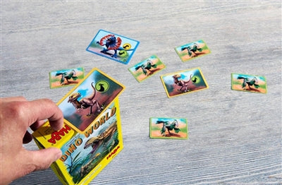 This fun game is for 2-4 players, aged 6 years + and typically lasts about 15 minutes. Great for fostering hand-eye coordination, this fast paced action game involves skill and patience. The aim is to carefully flick your dinosaur card from the box to land dinosaurs and capture the most prey.