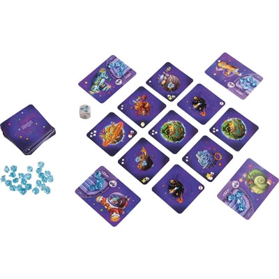 For 2-4 players. Play time approx 15 minutes. Contents: 40 square planet cards, 4 spaceship cards, 40 fuel crystals, 1 wooden die, 1 set of instructions.