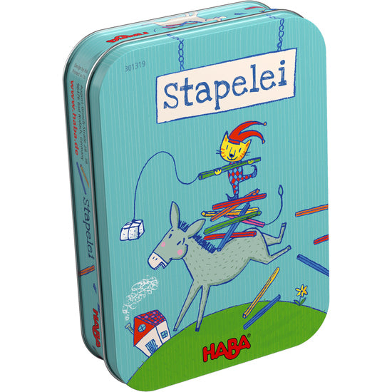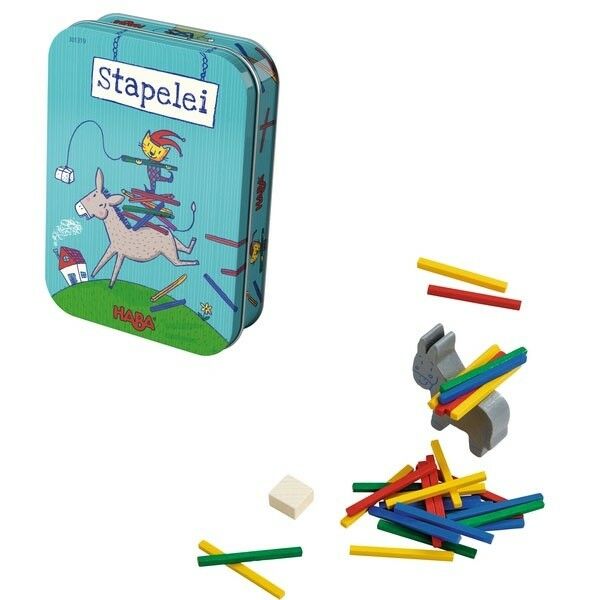 "Hee-haw! The pack mule is here!" He's standing patiently waiting for the trip, but before he can take off, the pieces of luggage need to be loaded! The object of Stapelei is to be the first to load all of the sticks onto the back of the mule without anything falling off.
