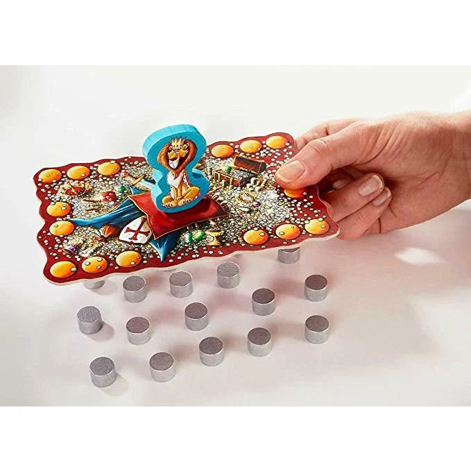 King Leo is guarding his huge treasure of valuable silver. Unfortunately he's somewhat lazy, and he dozes off now and then. His dozing opens up the opportunity for players to attempt to skillfully snatch King Leo's valuable silver nuggets from underneath the board without him noticing. To do this, you need courage, skill, and a steady hand.