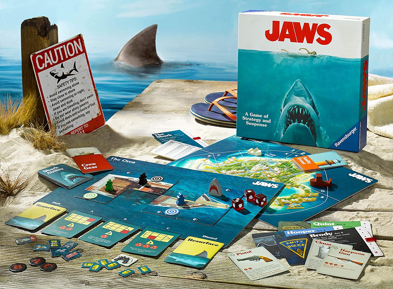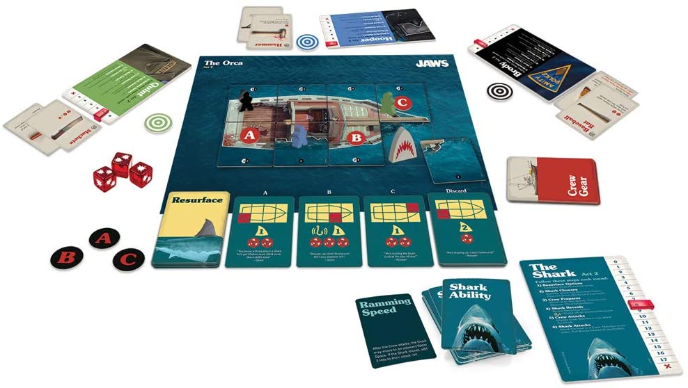 Gameplay is divided into two acts - Amity Island and The Orca, played on a double-sided board to replicate the film's story.