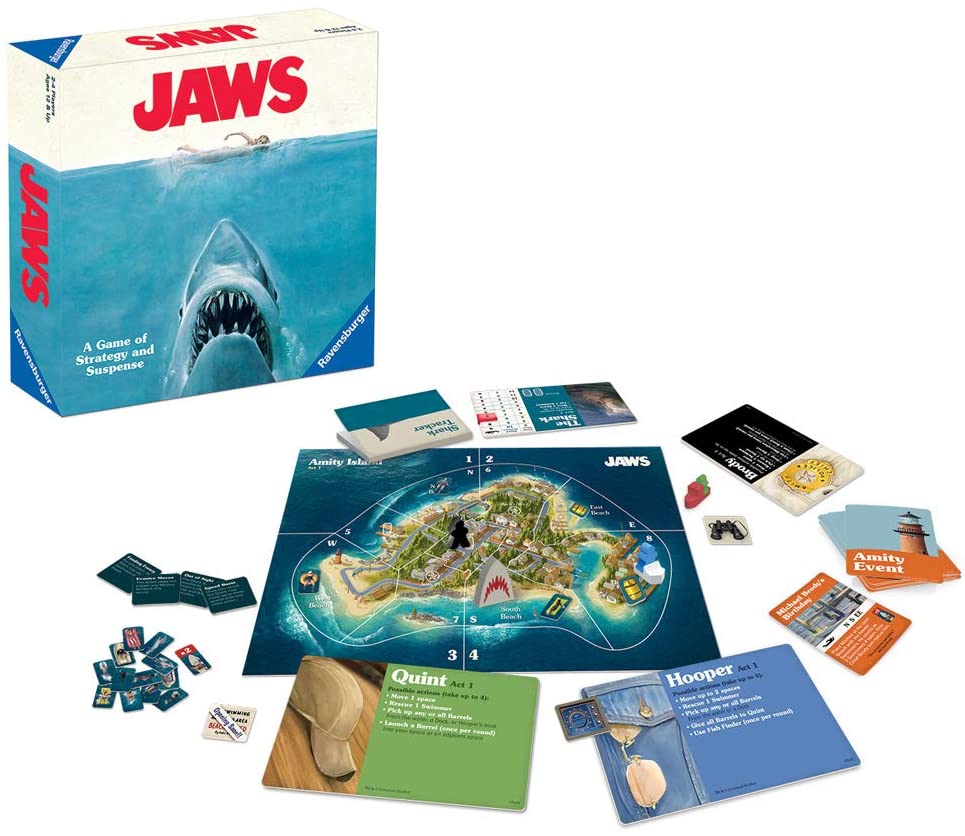 In JAWS, one player takes on the role of the killer shark off Amity Island, while the other 1-3 players take on the roles of Brody, Hooper and Quint to hunt the shark. Character and event cards define player abilities and create game actions for humans and the shark.