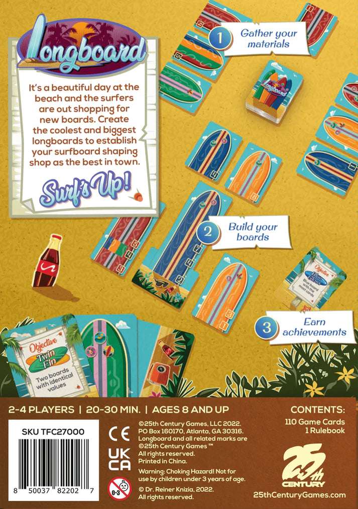 In Longboard, players draft and trade surfboard pieces as they attempt to build the tallest and most surfboards. Created by award winning games designer Reiner Knizia, Longboards is the perfect holiday and on-the-go game!