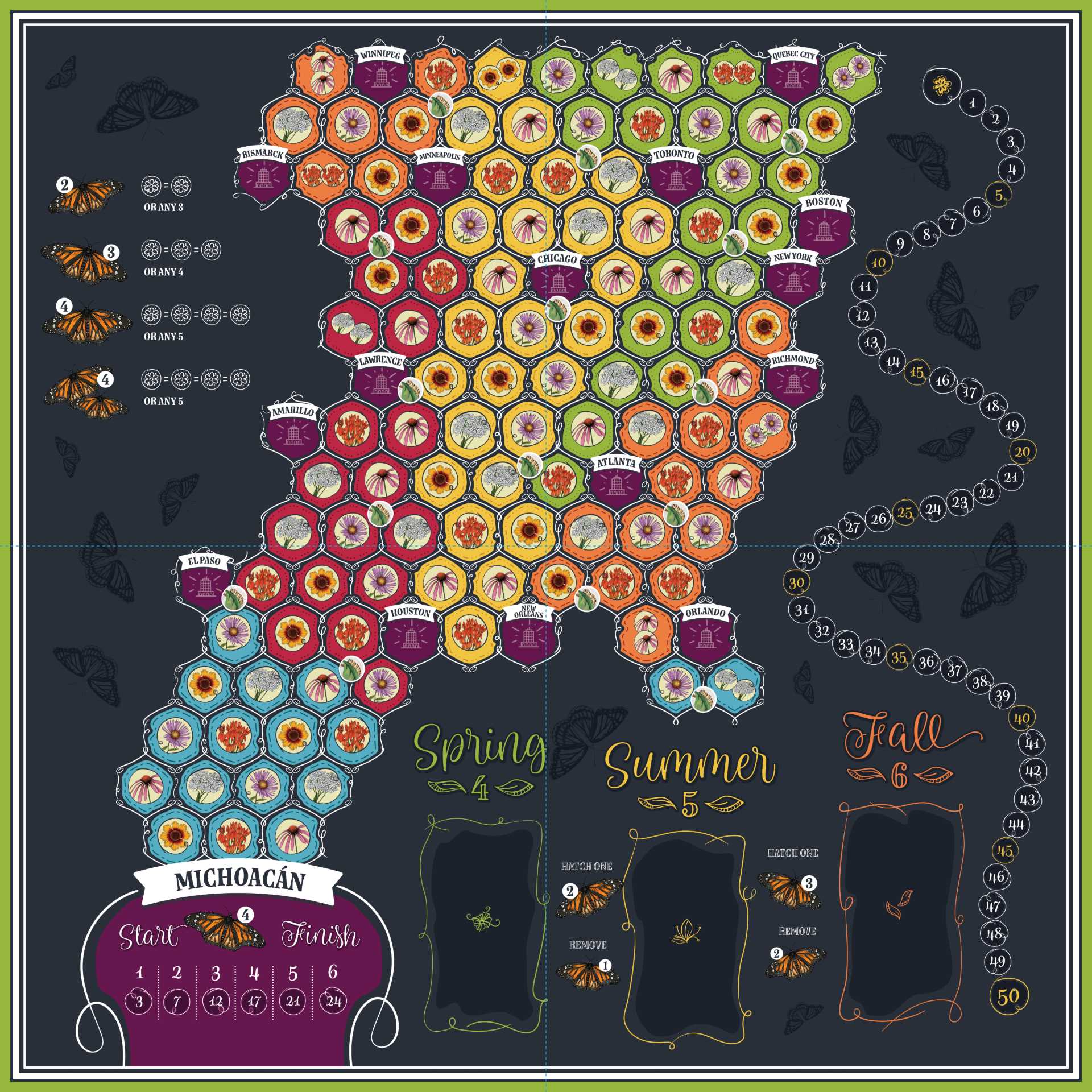 Designed by Elizabeth Hargrave (The award winning designer of Wingspan), Mariposas is a beautiful game where players guide monarch butterflies on their journey along eastern North America.
