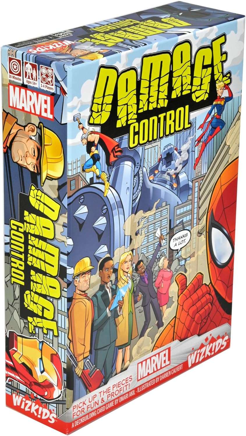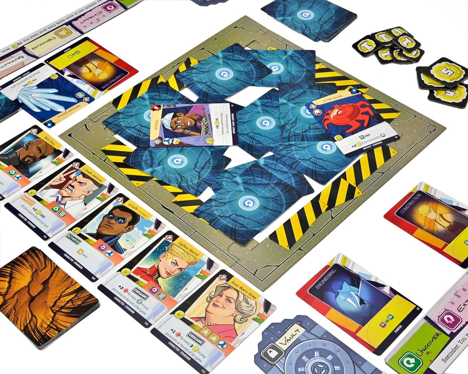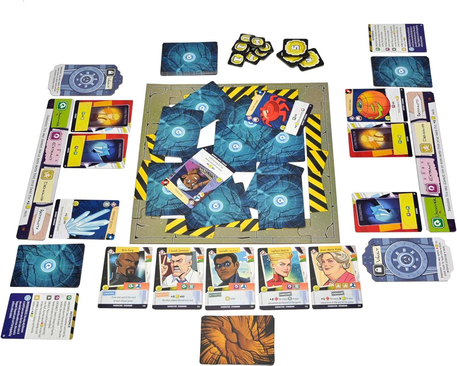 As part of the team responsible for handling the destruction zone, you'll utilize your team of Damage Control employees to demolish, reveal, and acquire Rubble Cards in pursuit of valuable items. These items can be used to enhance your deck's strength and efficiency, or you can safeguard them in your vault for points. However, be cautious! Only items stored in the vault will count towards your final score, so don't hold onto them for too long. On top of that, you'll also have to handle various claimants as a member of the organization, such as people complaining about traffic or attempting their own scavenging. And let's not forget the curious onlookers hoping to catch a glimpse of the heroic (or villainous) figures involved!