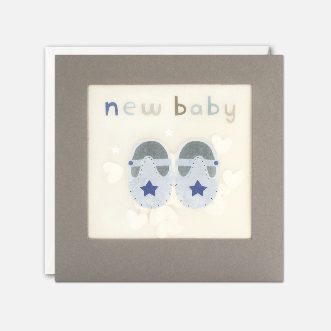 This sweet card features a pair of blue shoes and the words "New Baby" and is filled with white paper confetti stars.