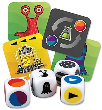 At the start of a round, one player rolls four special dice which indicate the color, shape and pattern of the amoeba being sought as well as the color of the lab it left and in which direction it was traveling. Competing at the same time, players need to find the lab, then move in the right direction to spot the amoeba (which may, of course, be striped and not spotted).