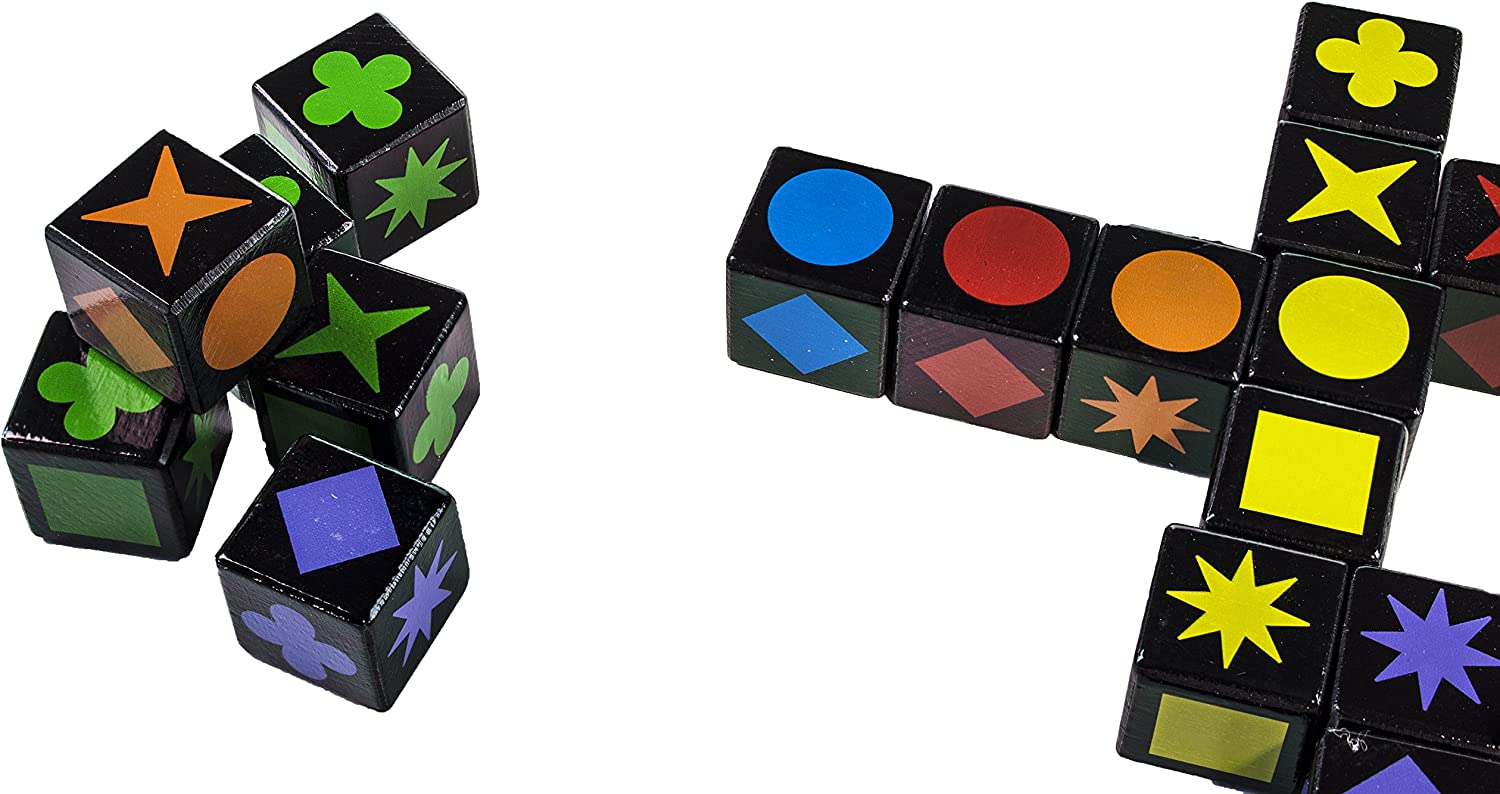 Qwirkle Cubes plays much like the original Qwirkle game. Create rows and columns of matching colours or shapes to score the most points,  but adds to the strategy because you can roll your cubes for more chances to play the exact shapes you want!