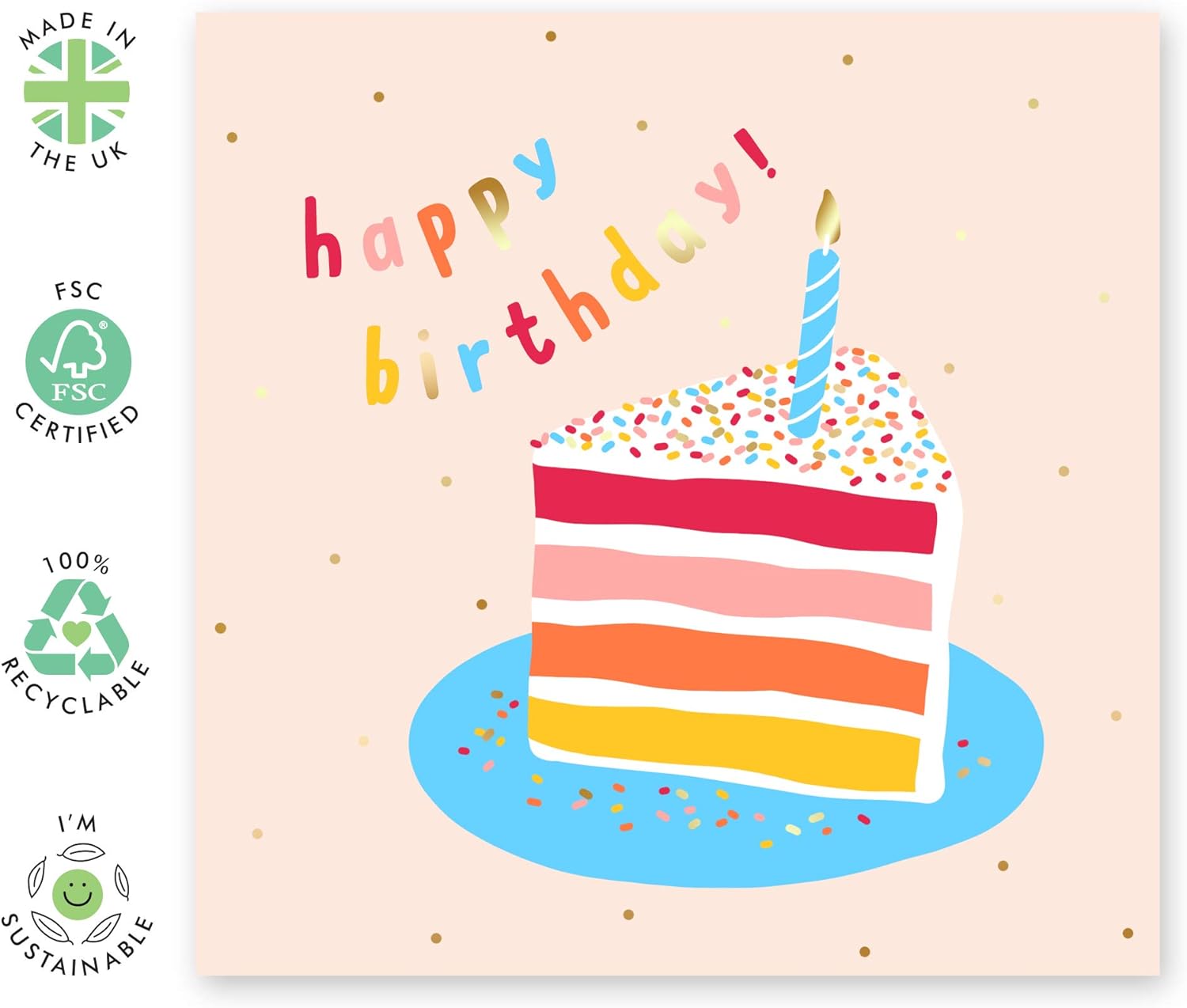 This fun card features a rainbow birthday cake with sprinkles and colourful sparkly polka dots with the words "Happy Birthday"