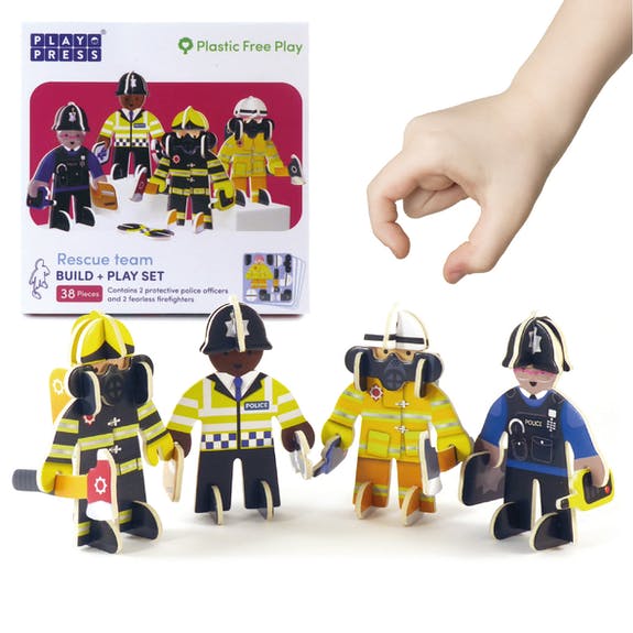 Ready for action - to the rescue! This brilliant Rescue Eco-Friendly Build and Play Set by Playpress contains 4 characters -  2 police officers and 2 fearless firefighters, along with all the kit that they need!