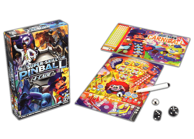 Super-Skill Pinball 4-Cade - a the arcade classic brought to the tabletop with art, atmosphere, and roll-and-write mechanisms.