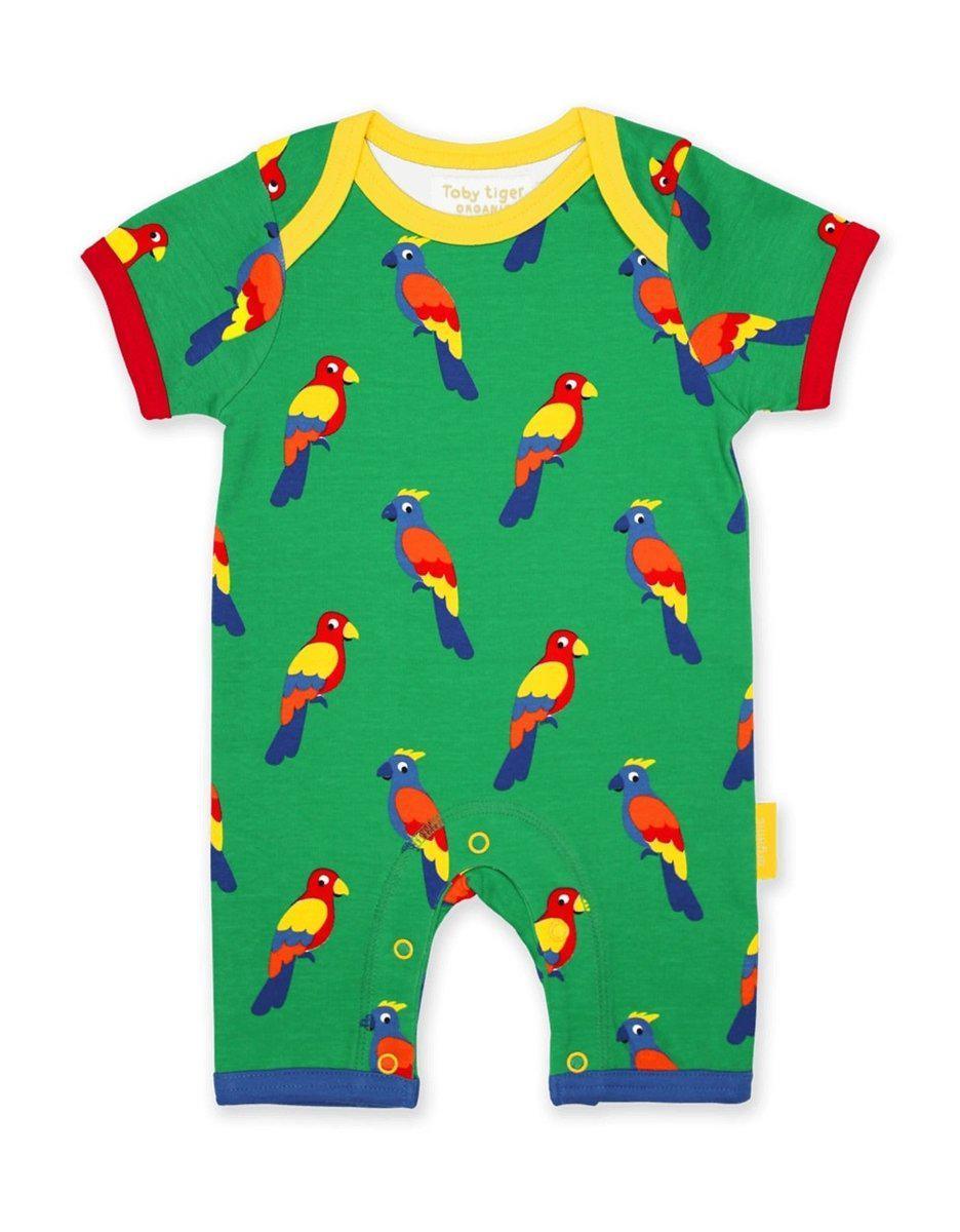 This fab bright and bold bold romper features multi-coloured parrots and is complete with contrasting red, yellow and blue trim. Perfect for baby boy or girl.