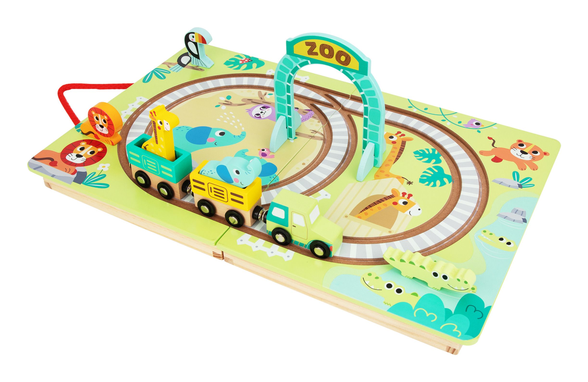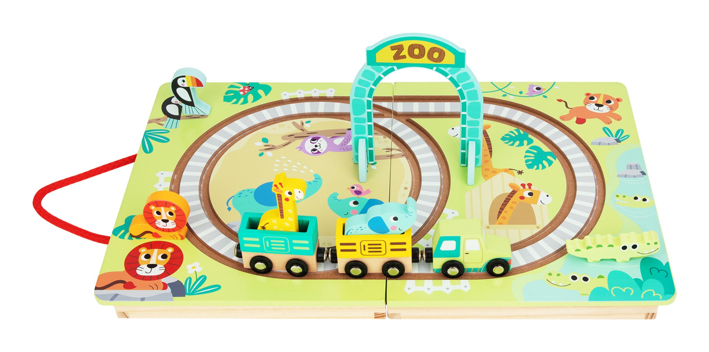 Tooky Toy Wooden Tabletop Railroad Zoo - a fun and colourful zoo set that folds up for easy storage and on-the-go fun!