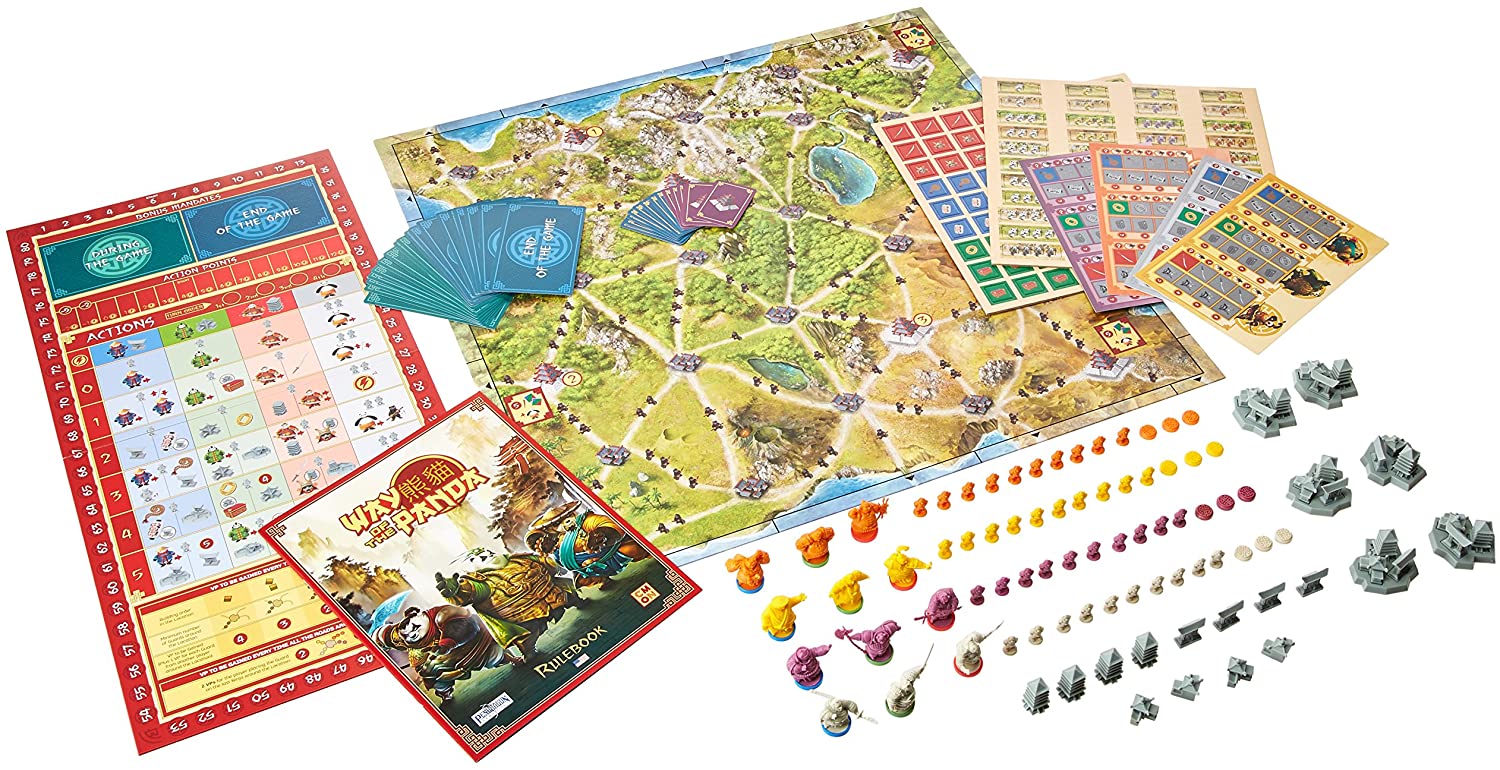 Way of the Panda is a worker-placement game in which players control three different figures — monk, merchant, and warrior — on a board. With a worker-placement mechanism, the players choose their action to move around the board, build buildings, train their character in fighting, and gain wisdom (which nets victory points at game's end and serves as a multiplier), but they also have to pay action points to choose these actions. If they choose stronger actions, they must pay more and cannot go back on the action board (as in Egizia).