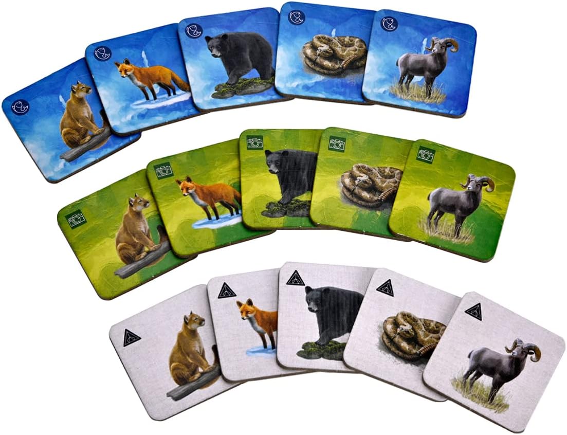 Each turn, you’ll move your photographer one space in any direction, or more, according to that animal on your tile! These movements are all thematic to the specific animal, and dangerous animals can move your opponent as well! For example the Red Fox’s agility lets you move one, two, or three spaces, changing direction on the way, while the Cougar moves one direction, right to the edge of the board, knocking your opponent if they’re in the way. You’ll also collect that animal tile after using their movement, which you can use for photo cards and bonuses!