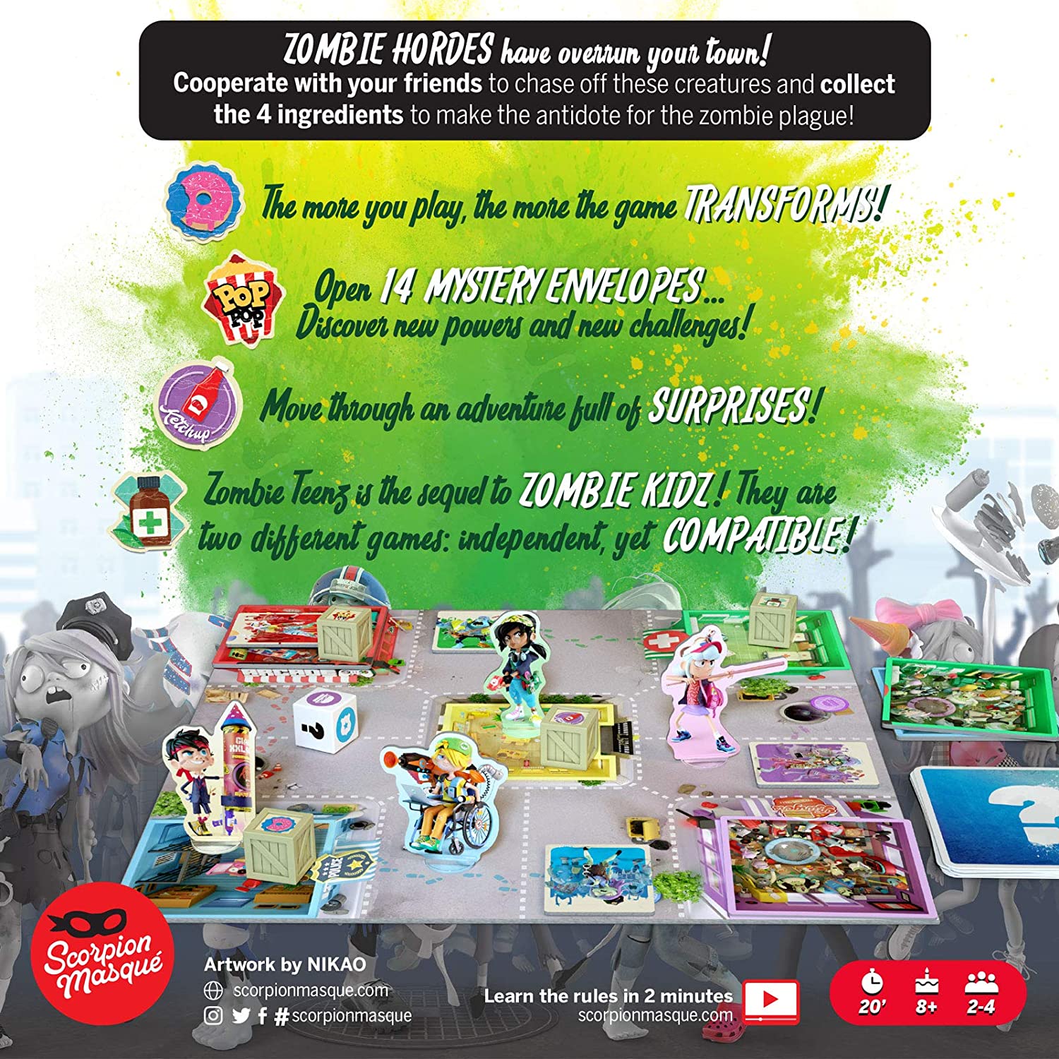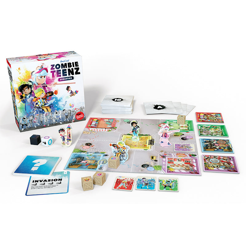 Zombie Teenz Evolution is the sequel to Zombie Kidz Evolution. It's a standalone game with a different set of rules, so you don’t need to have played the first game to jump into the second. The rules are slightly more advanced and will require a little more strategic thinking. It's a co-operative game: all players win (or lose) together against the zombies. To win, you must bring the four ingredient crates to the school before the zombies overrun the four buildings in the town.